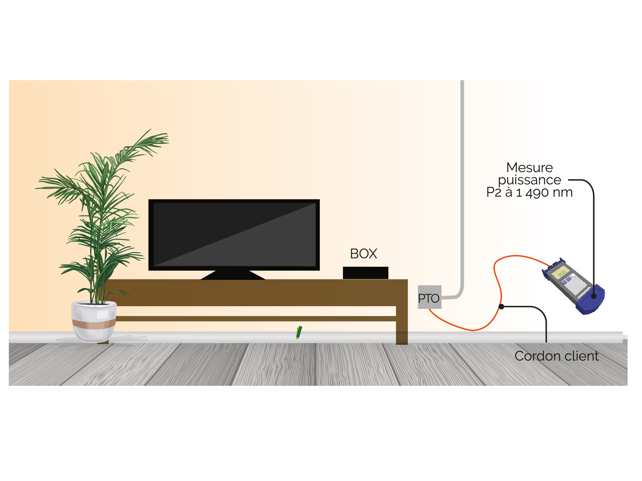 Une fois la PTO posée, y connecter le cordon client, et à l’aide d’un photomètre, relever la puissance P2 à 1490nm (Pour rappel, le cordon, entre tiroir coupleur et tiroir distribution est posé et l’OLT est actif). Cette puissance devrait être supérieure à -24 dBm (à titre d’exemple, notez que -23 dBm est supérieur à -24 dBm).